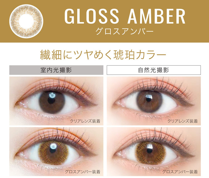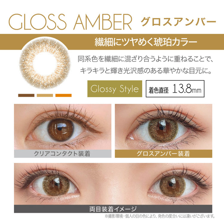 Tri-tone amber & beige under a soft brown ring give a glossy, bright finish. The 13.8 mm graphic enlarges gently for radiant, natural eyes.