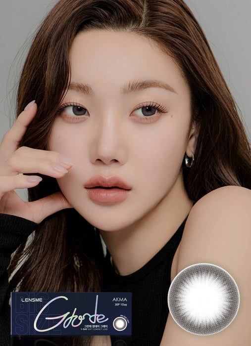 Lensme AKMA Grande Gray is a daily silicone hydrogel lens with a big 13.9 mm graphic diameter and a soft gradient gray pattern. A diffused gray ring frames the iris while the bright inner area keeps the center clear, giving cool-toned, larger eyes that still look naturally soft in everyday light and photos.