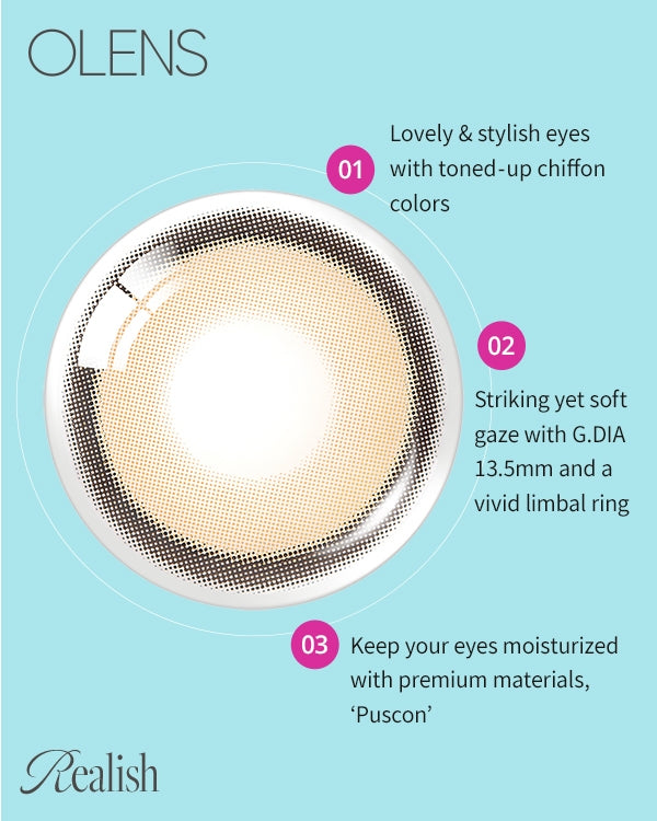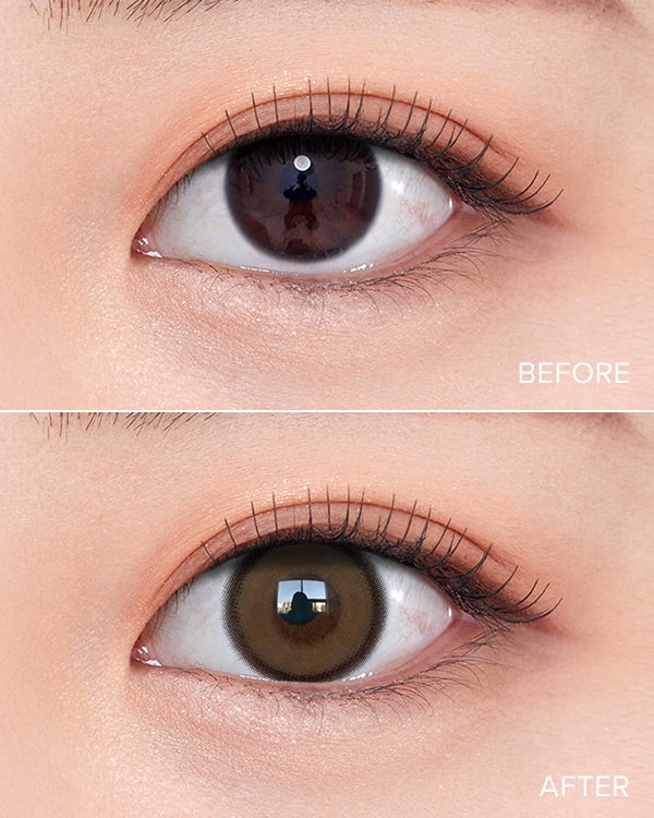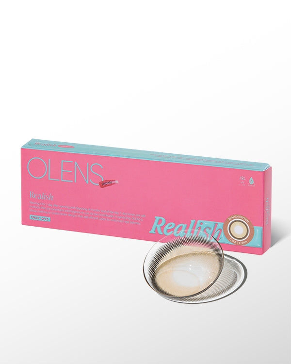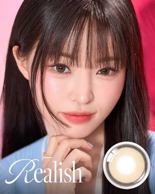 Realish 1Day Brown is its pixel-fused chiffon architecture: a delicate brown hue diffuses across micro-dot pixels from a soft center into a vivid limbal ring within the 13.5 mm graphic circle. This layered gradient captures and scatters light naturally, sculpting subtle depth and creating an organically enlarged, luminous brown-eyed effect without harsh boundaries.