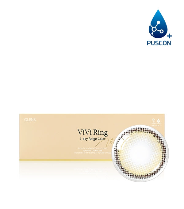 OLENS ViVi Ring 1 Day Beige daily disposables deliver a delicate soft-edge beige ring that gently enlarges your eyes with a natural glow. Each 10-pack is single-use for fresh, hygienic wear and comes in prescription (SPH -0.00 to -8.00) or non-prescription options.