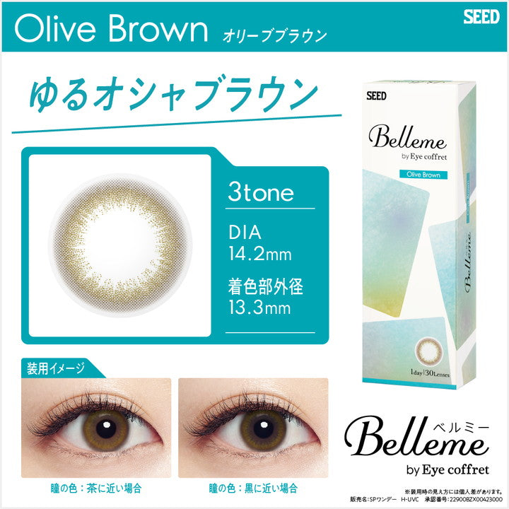 Olive × brown ring with a 13.3 mm G.DIA and a 6.5 mm opening - subtle depth with a crisp pupil.